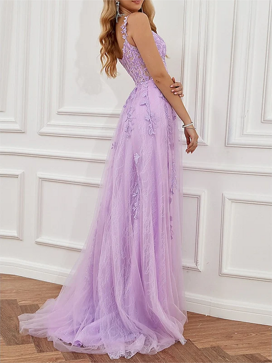 Women Tulle Appliques Prom Dress Long Side Slit Evening Gowns Princess Formal Party Dress YPD741