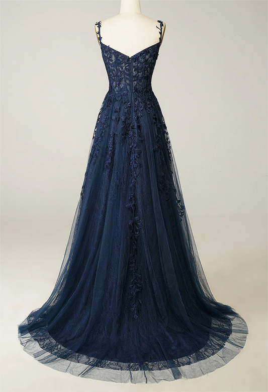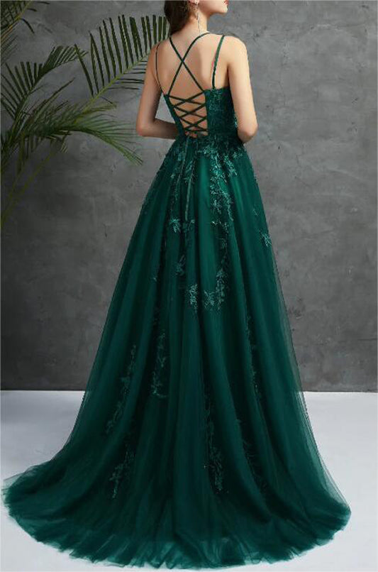 Women Tulle Lace Prom Dress Long Appliques Evening Gowns Spaghetti Straps Formal Party Dress YPD745