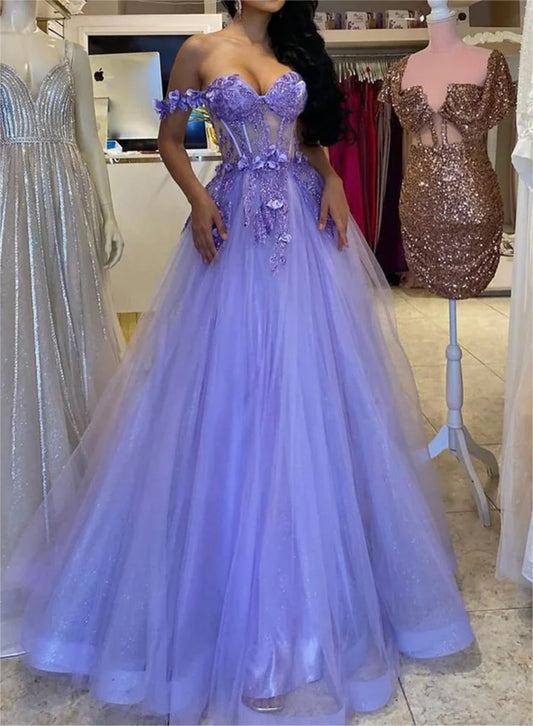Women A-Line Floral Prom Dresses Long Off Shoulder Lace Evening Gowns Sleeveless Formal Party Dress YPD625