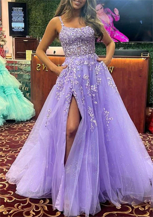 Women A-Line Lace Prom Dresses Long Appliques Slit Evening Gowns Sleeveless Formal Party Dress YPD618
