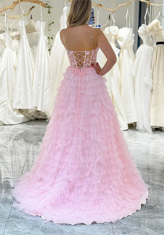 Women Slit Lace Prom Dresses Long Spaghetti Straps Appliques Evening Gowns Sleeveless Formal Party Dress YPD622