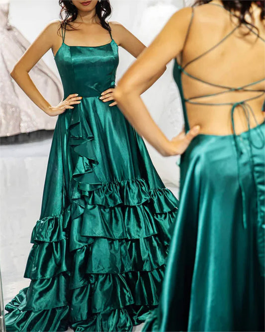Women A-Line Satin Prom Dresses Long Ruffle Evening Gowns Sleeveless Formal Party Dress YPD604
