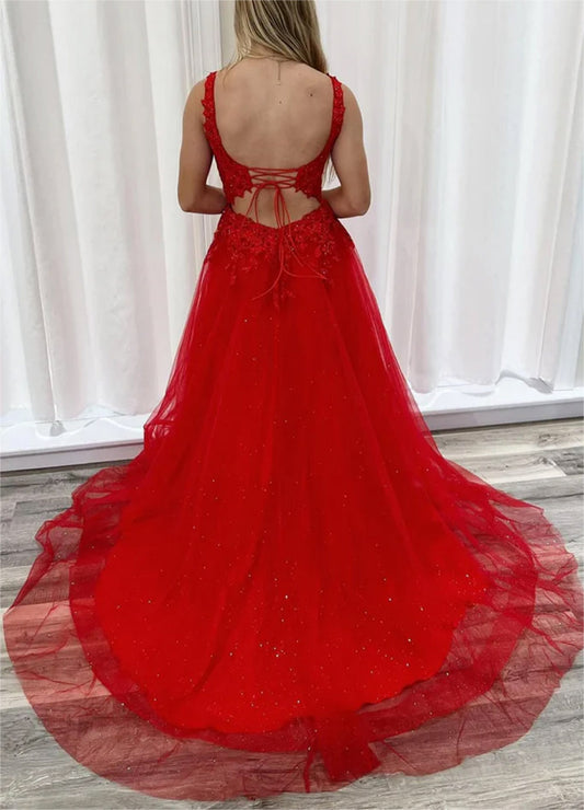 Women A-Line Lace Prom Dresses Long Slit Appliques Evening Gowns Sleeveless Formal Party Dress YPD612