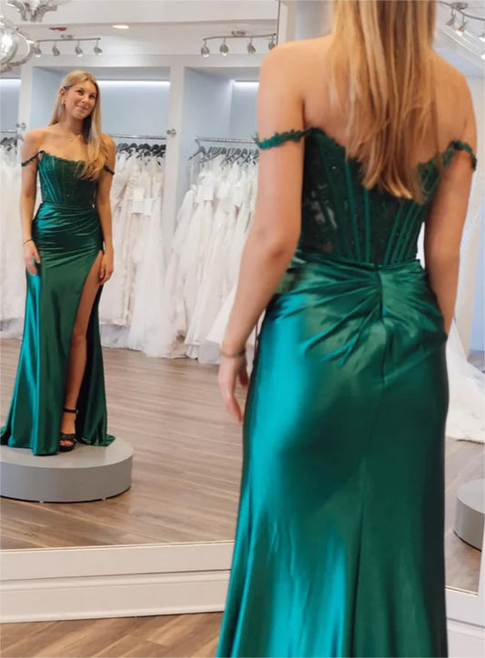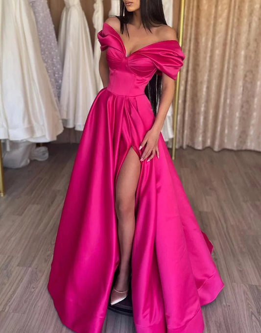 Women V-Neck Satin Prom Dresses Long Slit Evening Gowns Off Shoulder Formal Party Dress YPD598