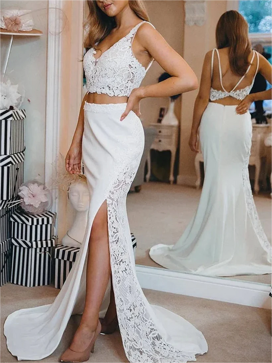 Women V Neck Lace Prom Dresses Long 2 Piece Mermaid Evening Gowns Formal Party Dress YPD418