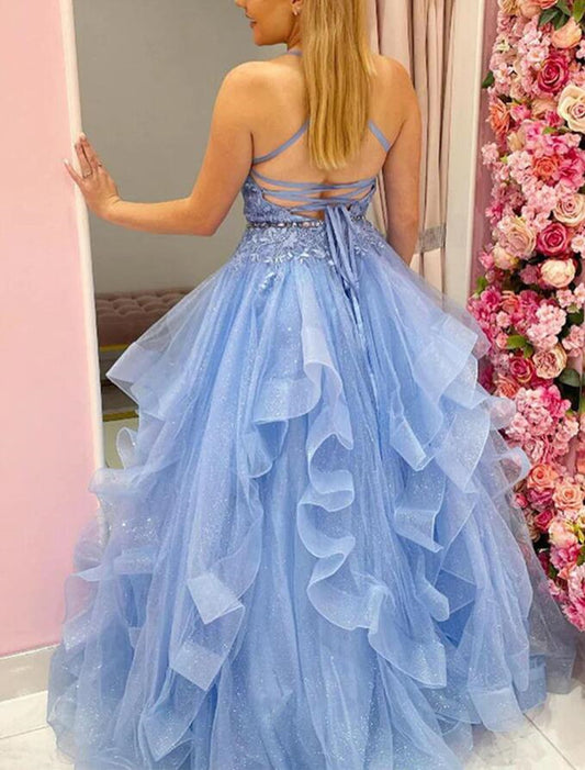 Women Light Blue Lace Prom Dresses Long A-Line Evening Gowns Formal Party Dress YPD416