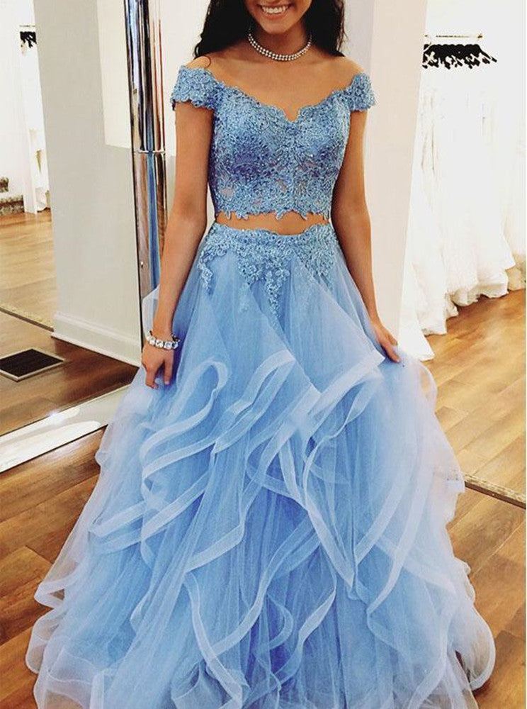 Women Blue 2 Pieces Prom Dresses Long Appliques Evening Gowns Formal Party Dress YPD336