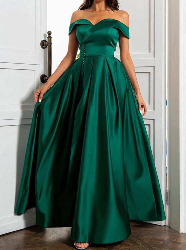 Women Off Shoulder Satin Prom Dresses Long Green A-Line Evening Gowns Formal Party Dress YPD406