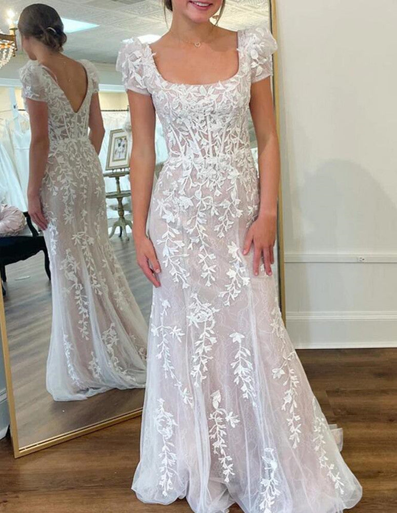 Women Tulle Appliques Prom Dresses Long Cap Sleeves Evening Gowns Formal Party Dress YPD371